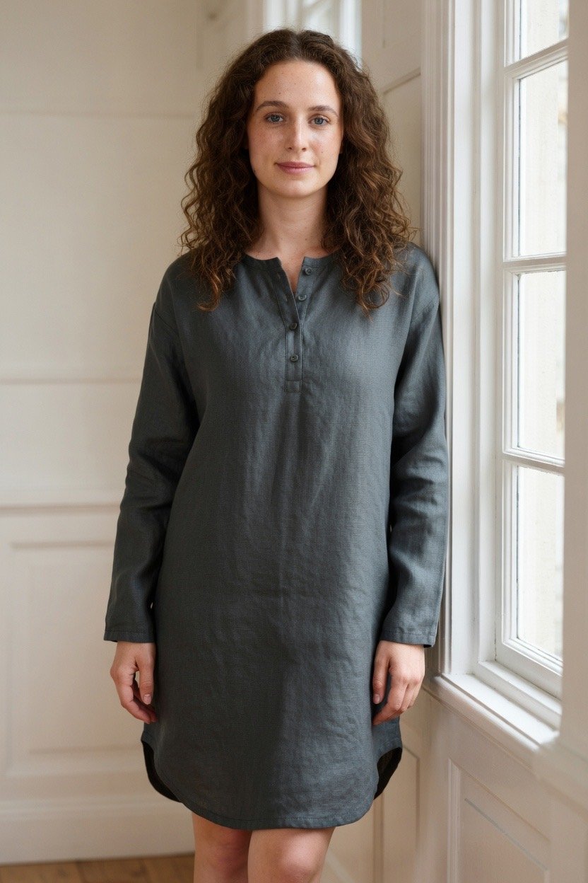 A camisa de dormir de linho para mulher combina o toque fresco e respirável do linho com um design subtil e feminino, ideal para quem valoriza conforto sem abdicar da sofisticação. Confeccionada em linho de alta qualidade, proporciona uma sensação de suavidade sobre a pele e uma regulação térmica natural — perfeita para noites tranquilas em qualquer estação.